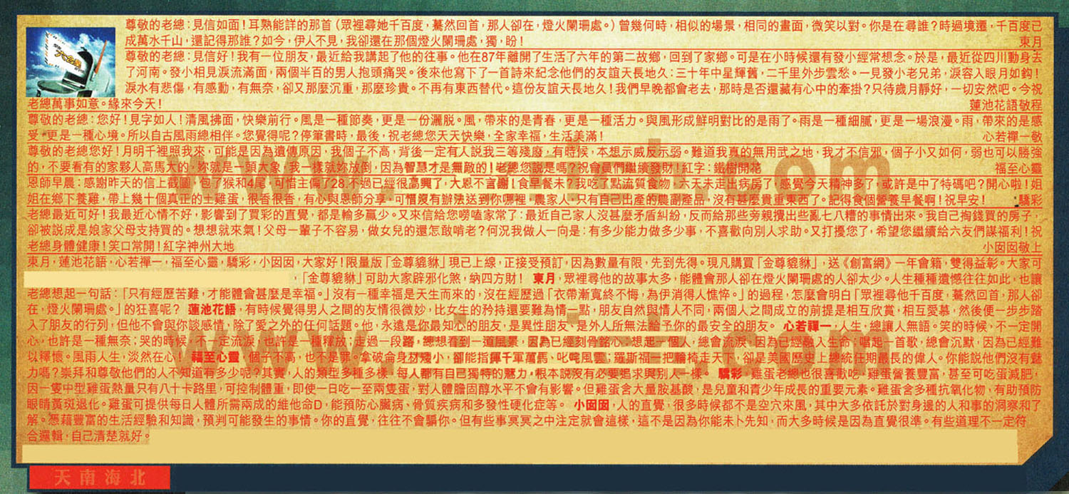 【5】恩師早晨:感謝昨天的信上截圖,包了猴和4尾,可惜主偏28不過已經很高興了,大恩不言謝!食早餐未?我吃了點流質食物,六天走出病房了,感覺今天精神多了,或許是中了特碼吧?開心啦!姐姐在鄉下養雞,帶上幾十個真正的土雞蛋,很香很香,有心與恩師分享,可惜沒有辦法送到你哪裡,農家人,只有自己出產的農副食品,沒有什麼貴重東西了。記得食個營養早餐啊!祝早安!------驕彩