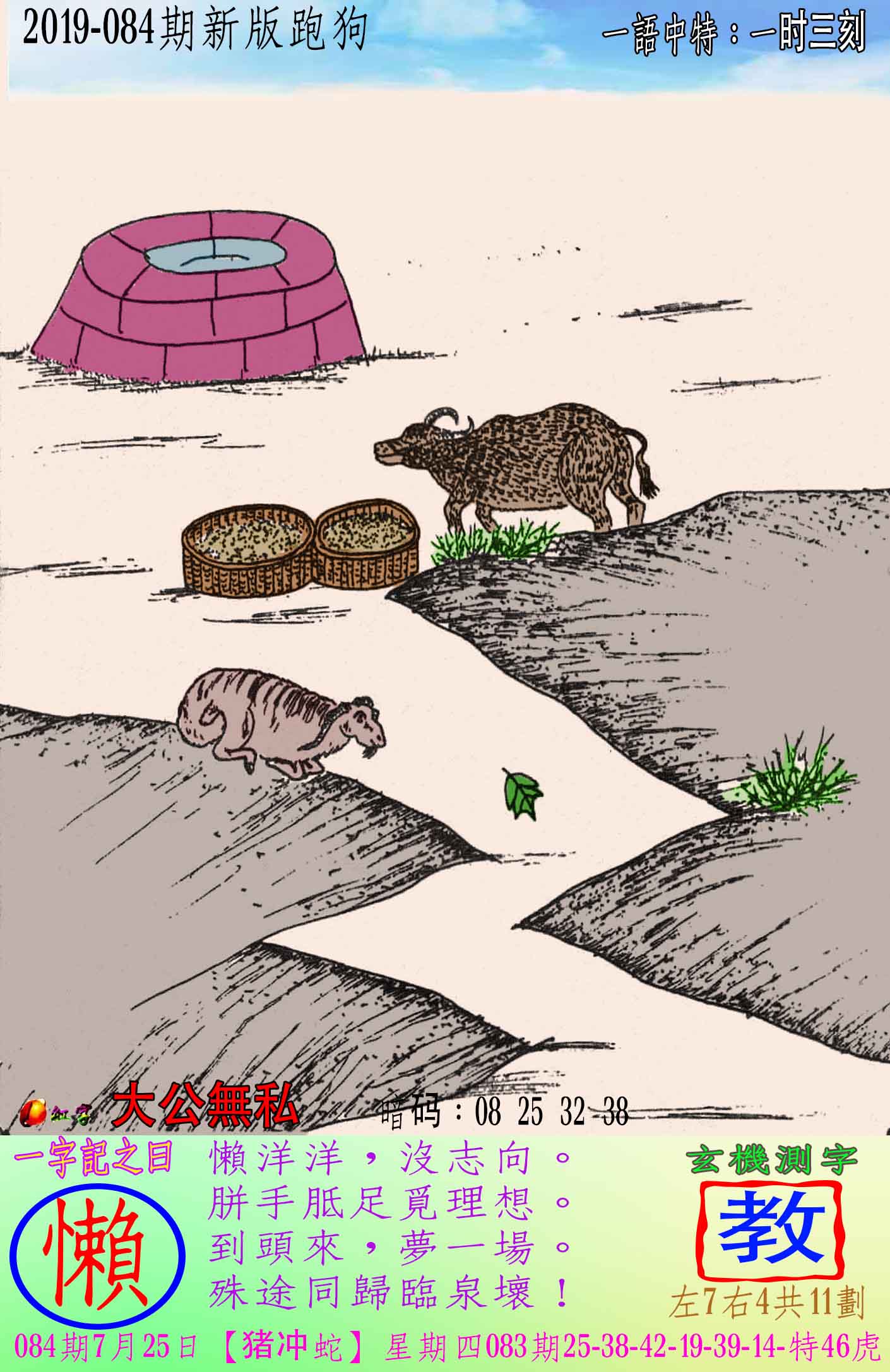 084期新版跑狗一字記之曰:【懶】 懶洋洋,沒志向。胼手胝足覓理想。 到頭來,夢一場。殊途同歸臨泉壞! 玄機測字:《教》