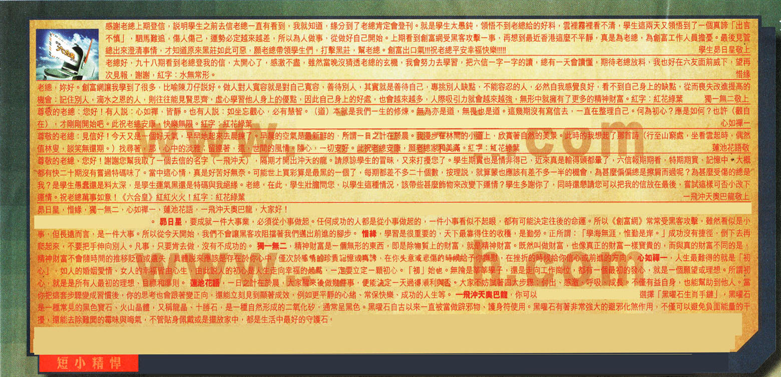 【2】老總好,九十八期看到老總登我的信,太開心了, 感激不盡,雖然當晚沒猜透老總的玄機,我會努力去學習,把六信一字一字的讀,继有一天會讀懂,期待老總放料 ,我也好在六友面前威下 ,望再次見報,謝谢,紅字:水無常形。---惜緣